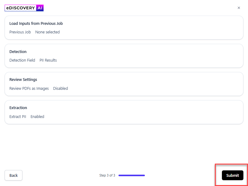 Select Next, then select Submit after reviewing the job details. The documents will be sent to eDiscovery AI and the results extracted.