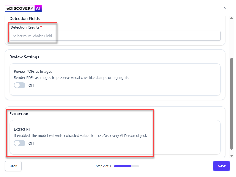 Select the multi-choice field you wish to use for the PII Detection Results. Then, check the box for "Extract PII."