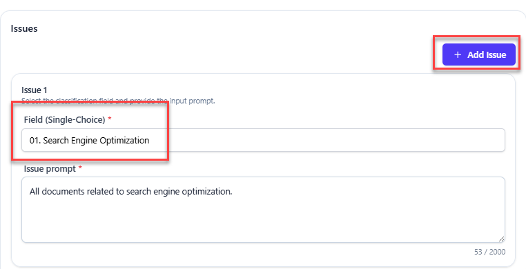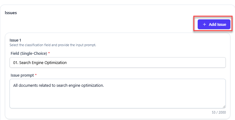 i) Custom instructions given to eDiscovery AI to define Relevance for each issue. The prompts for each issue must be no greater than 2,000 characters. The language in the prompt does not need to match the language of the document, i.e. English prompts will work on Korean documents. Note, up to 15, issues can be reviewed at once. Simply click the "+ Add Issue" button for more issues.